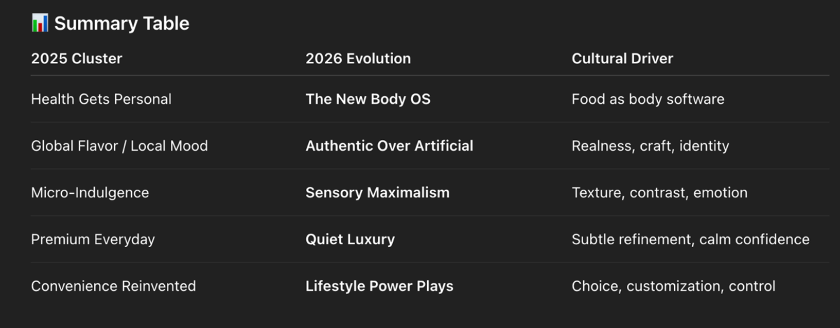 It also showed me what the trend decks don’t say out loud: that 2026 food culture is shifting from ingredients to identity. GLP-1 – turning wellness into software. Authenticity replacing novelty. Texture becoming luxury. And convenience evolving into agency. Those patterns were buried under hundreds of slides — until AI lined them up like chapters in one bigger story.